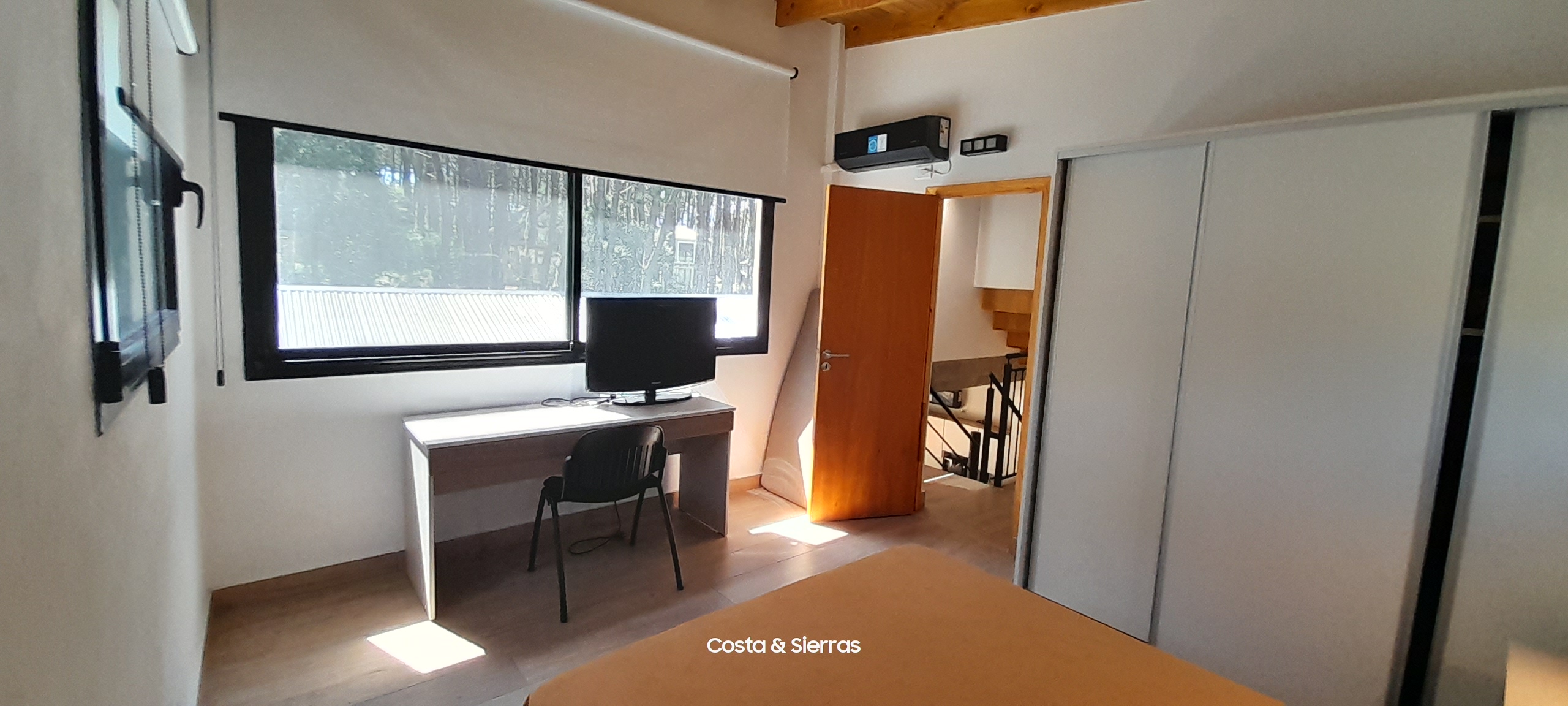 - Dormitorio matrimonial con TV, aire acondicionado y ventilador de techo.