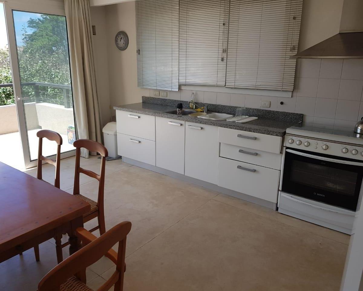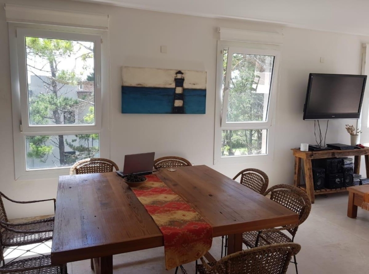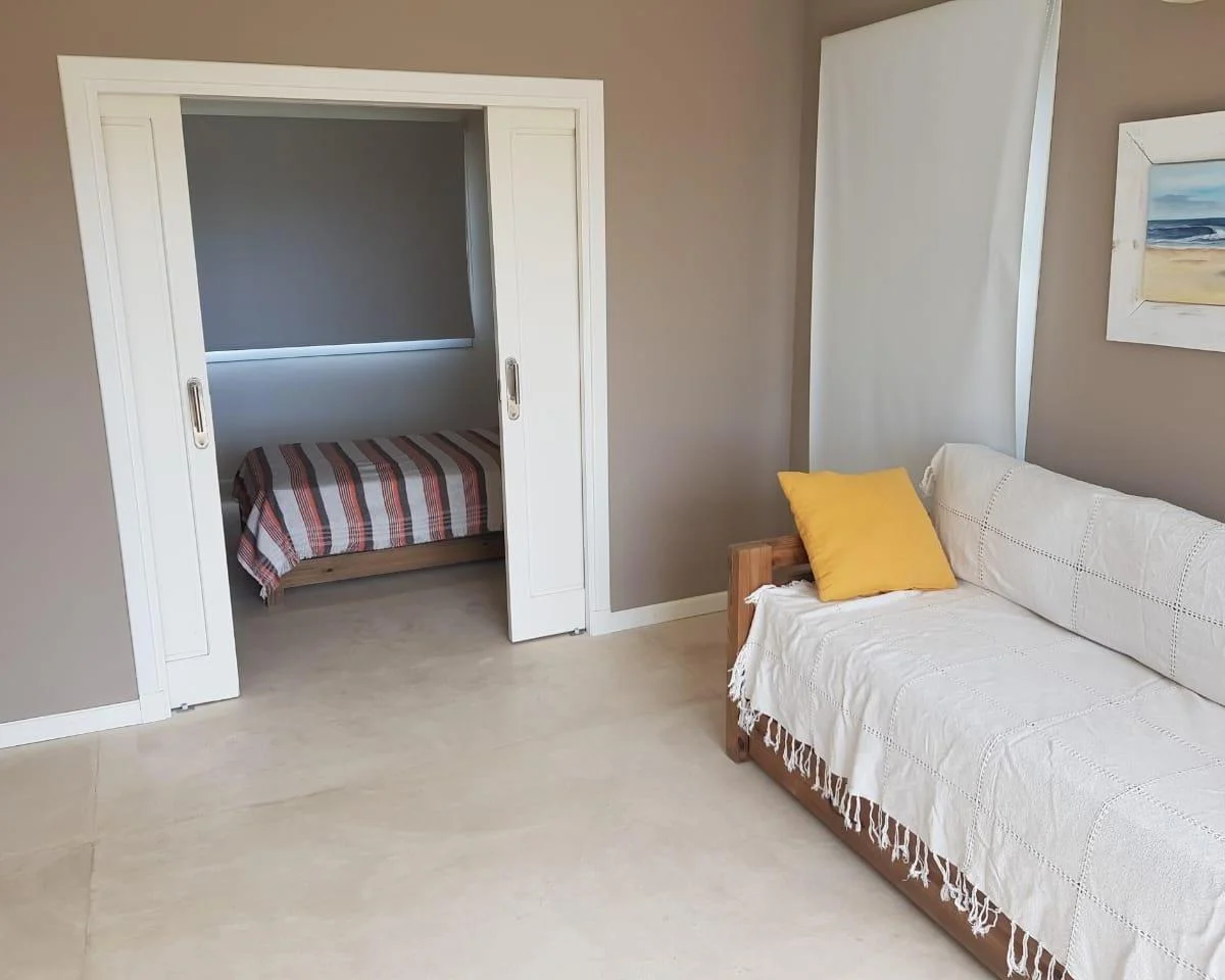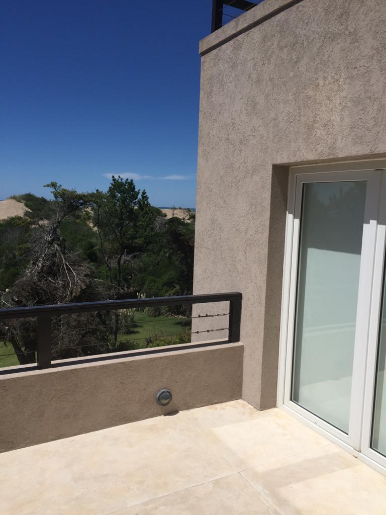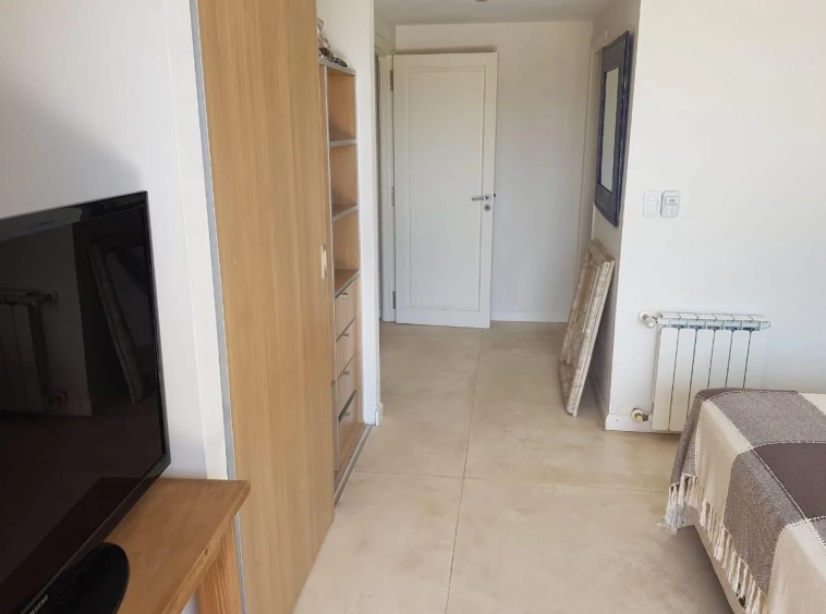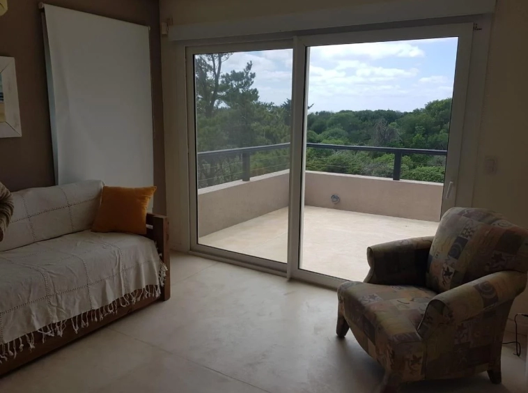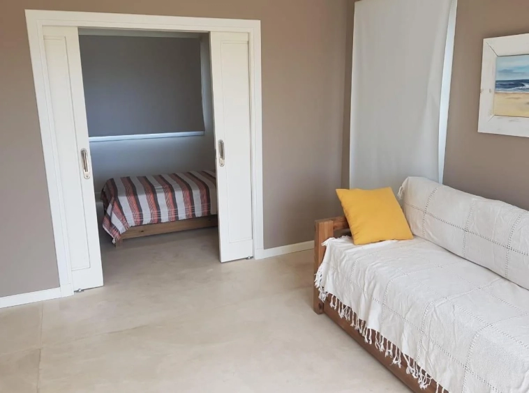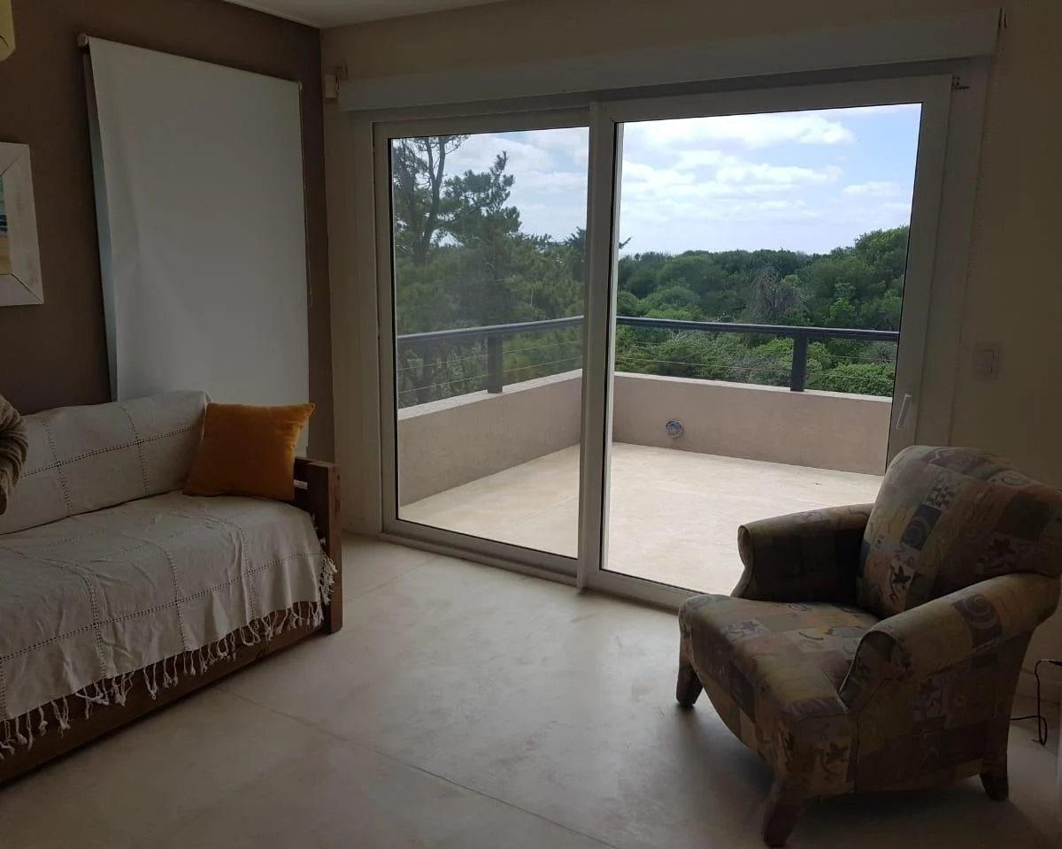 Los pisos de cemento alisado, las aberturas de doble vidrio en PVC y las paredes blancas crean un ambiente amplio y luminoso. En este nivel también encontrarás un toilette y un espacio de almacenamiento, así como un balcón terraza con vistas al parque y las dunas.