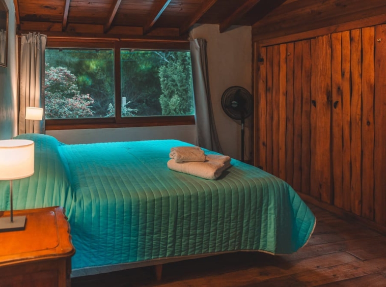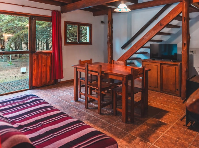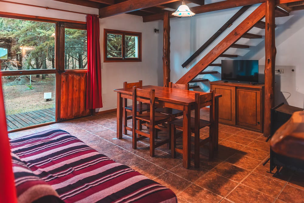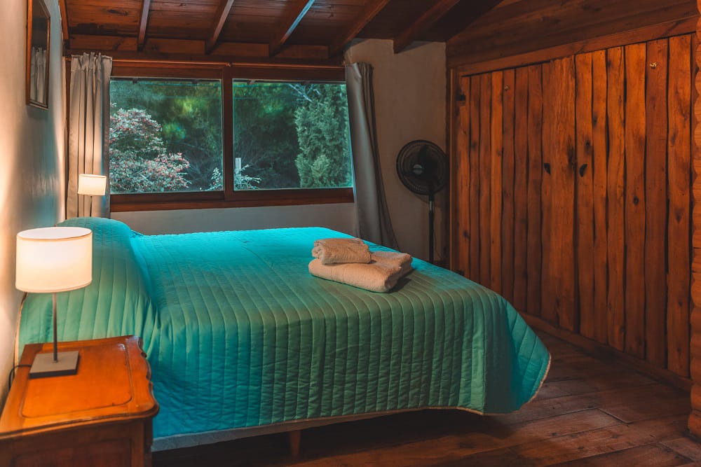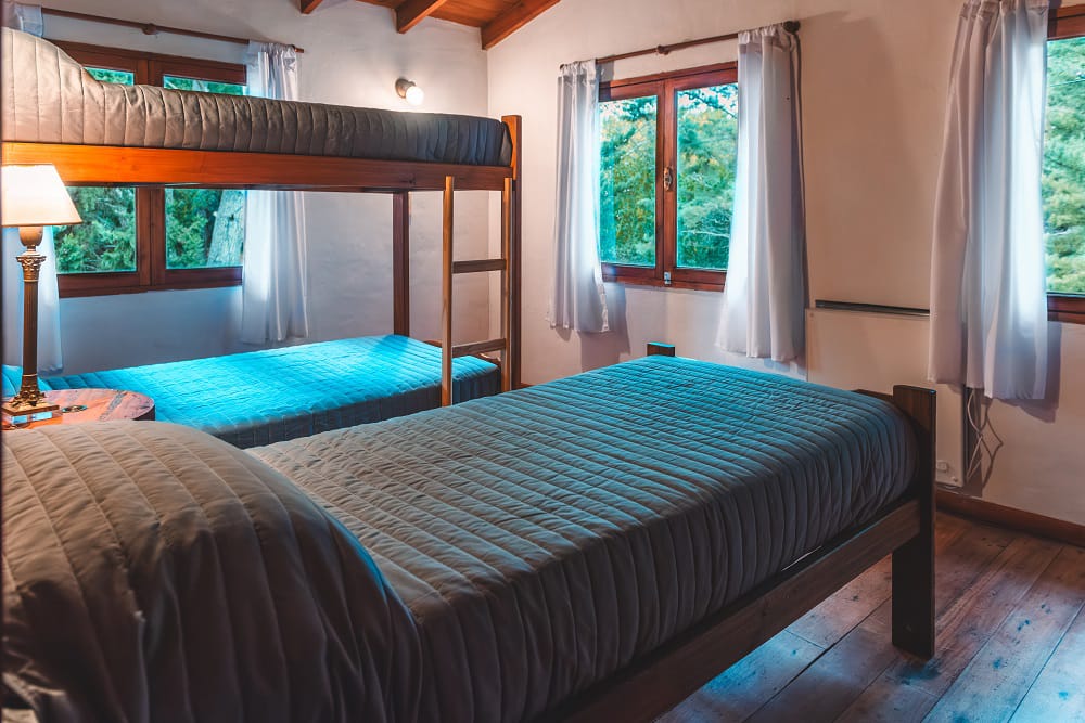 Las cabañas son de dos plantas para un máximo de 6 personas. Tienen dos habitaciones en la planta alta: una con cama matrimonial más una cama individual y otra con tres camas individuales .