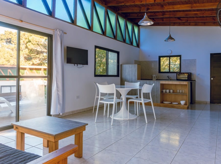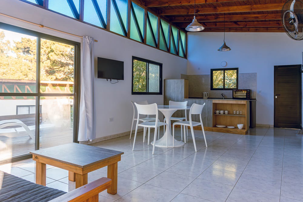 Las casas son de una sola planta para un máximo de 5 personas. Tienen dos habitaciones: una con cama matrimonial y otra con dos camas individuales más un sillón-cama en el living.