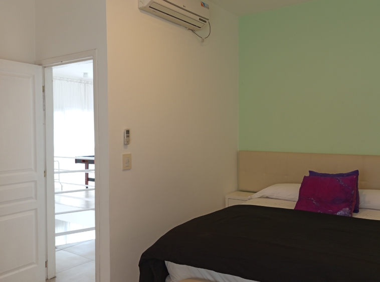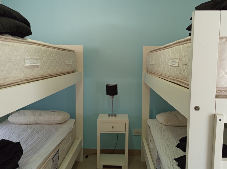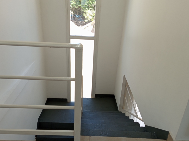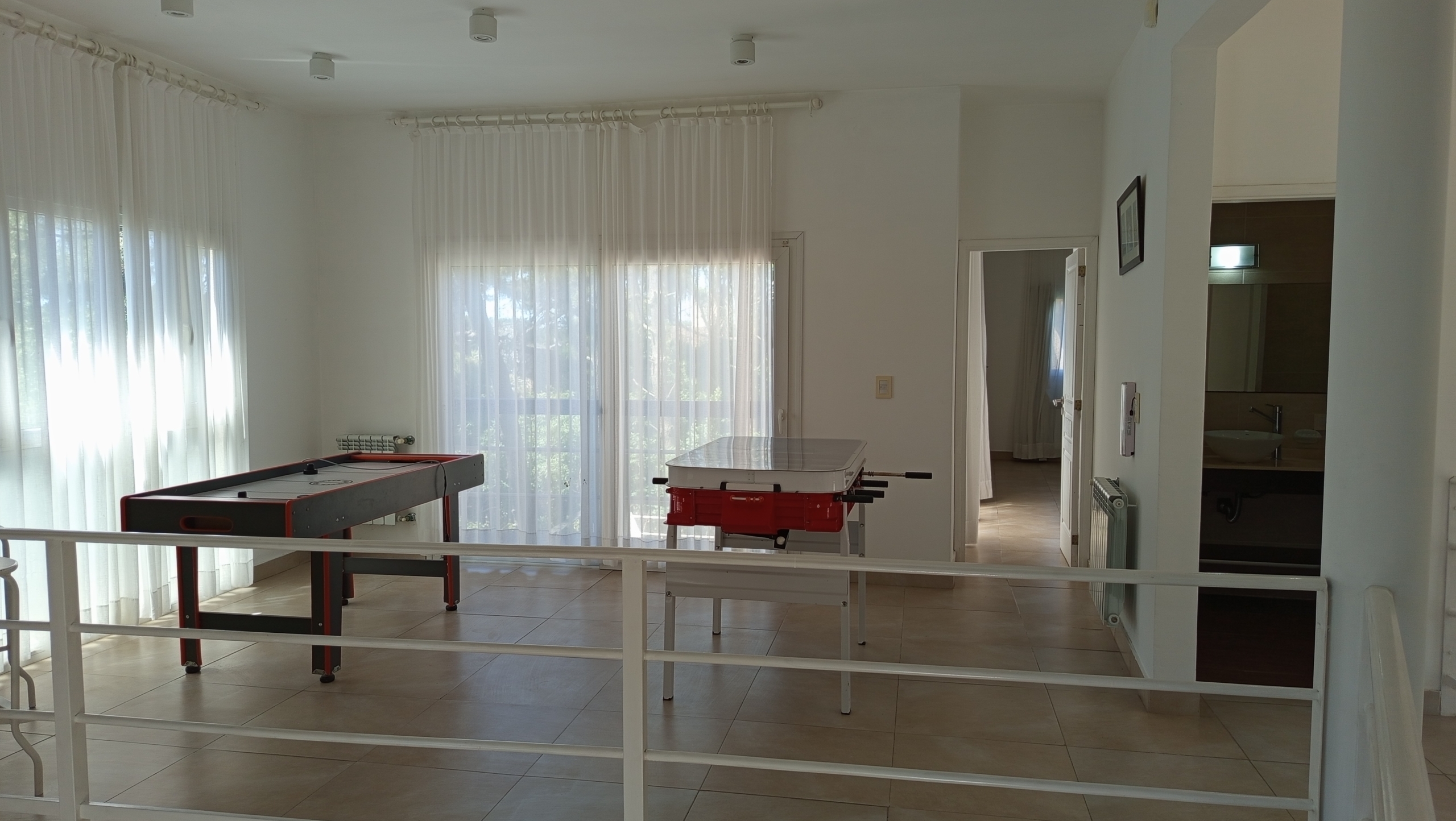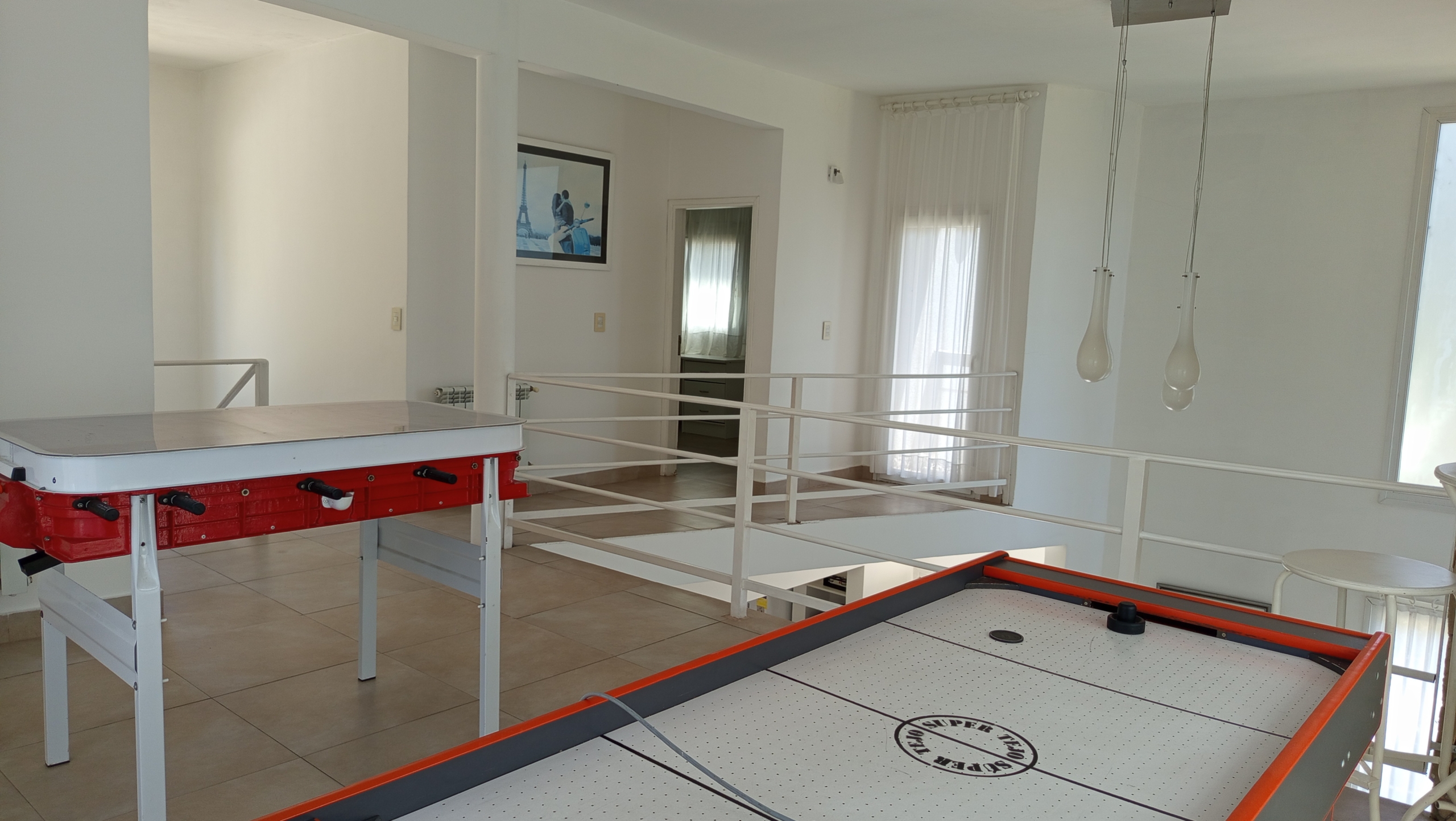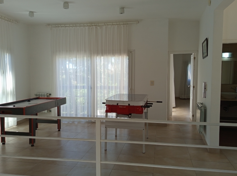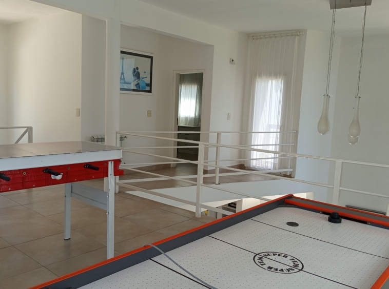 En el nivel principal, dos dormitorios con camas individuales ofrecen espacio para la comodidad de los huéspedes, mientras que un baño completo con bañera e hidromasaje brinda un oasis de relajación. Subiendo por las escaleras de cemento con detalles en hierro, nos encontramos con un luminoso estar que sirve como área de entretenimiento o sala de juegos, con acceso a un pequeño balcón.