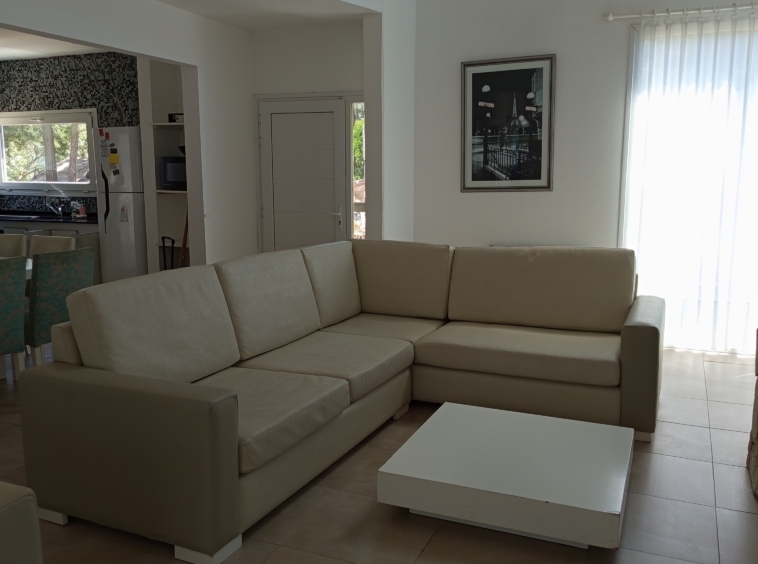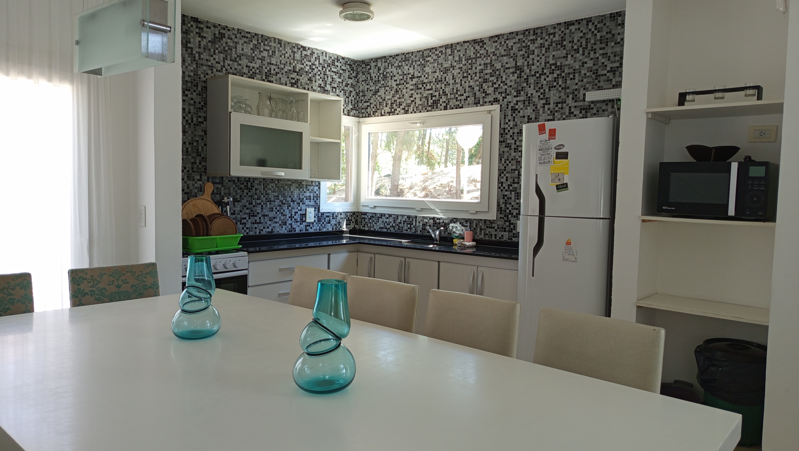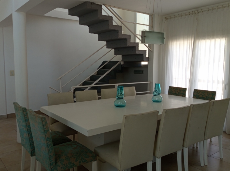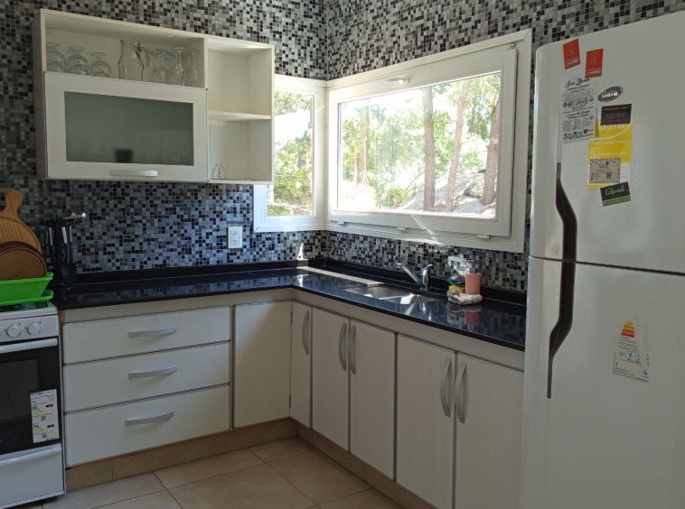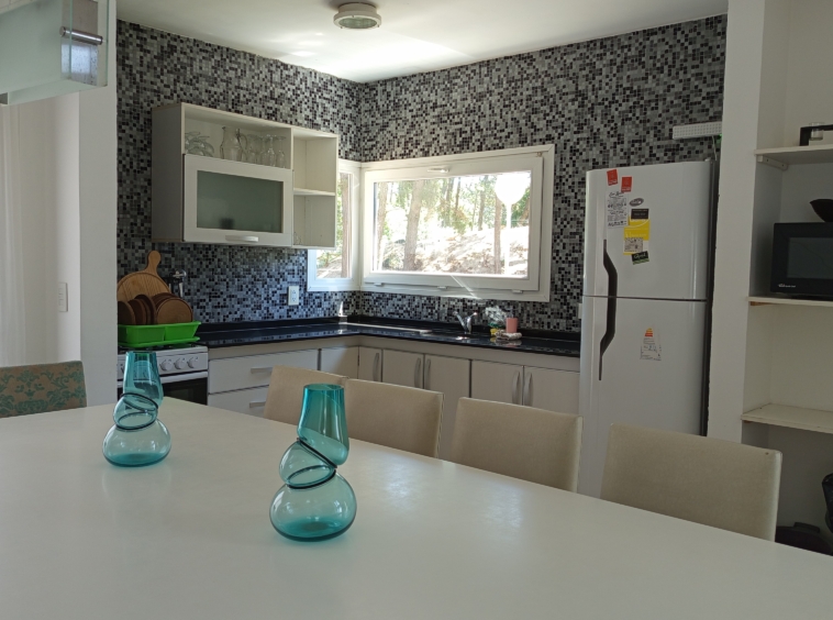 El diseño de concepto abierto de la casa permite una transición fluida entre los diferentes ambientes. La cocina, equipada con electrodomésticos de alta gama y una elegante mesada de granito negro, se integra armoniosamente con el amplio salón-comedor. Aquí, una mesa principal con capacidad para diez personas invita a disfrutar de deliciosas comidas en compañía de familiares y amigos.