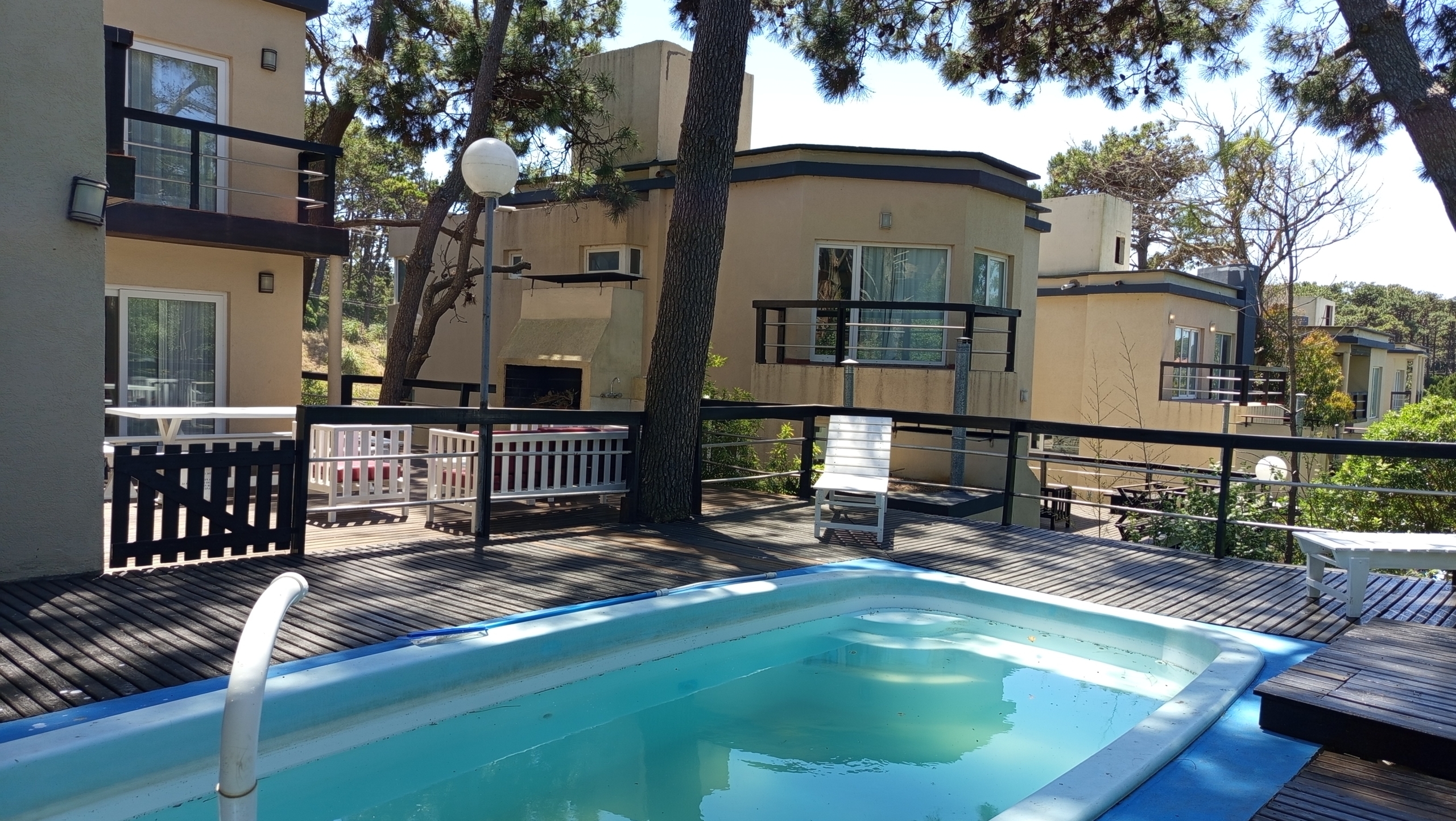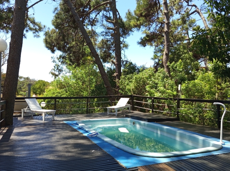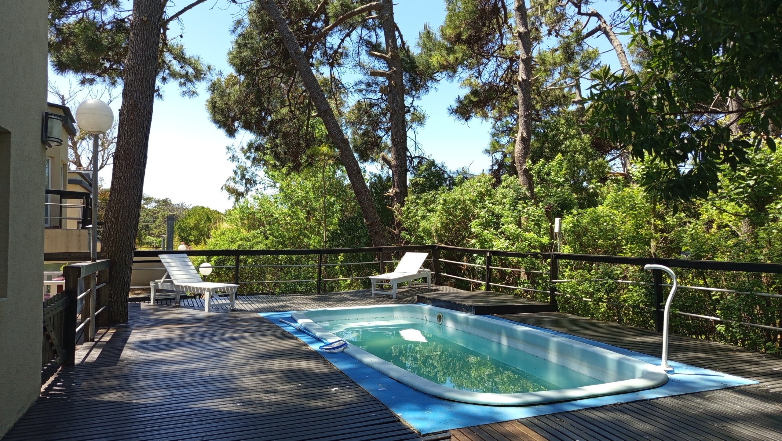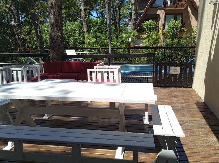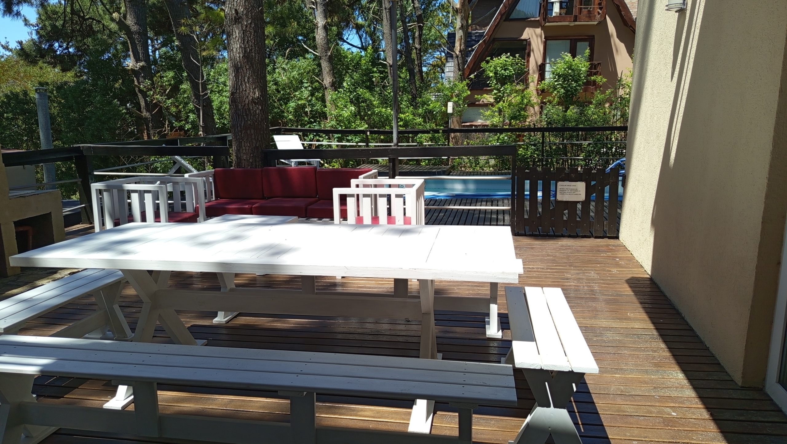 En el exterior, una amplia piscina rodeada de un deck de madera , parrilla y muebles de exterior.