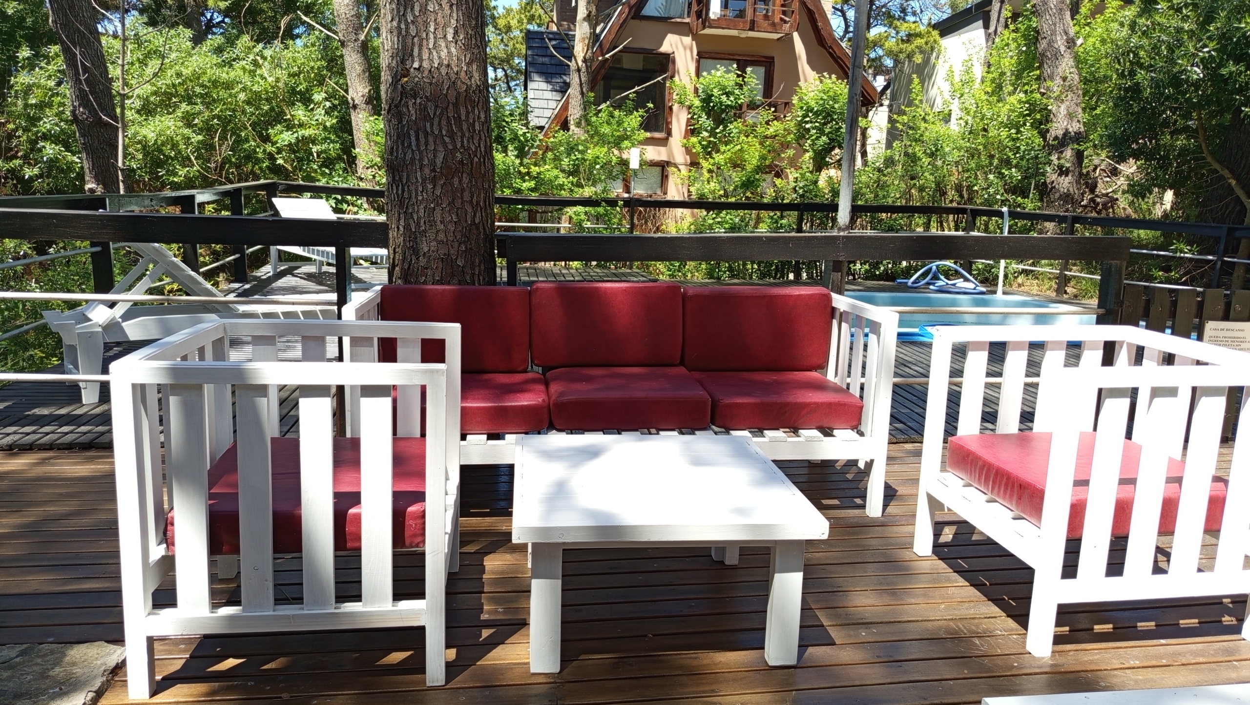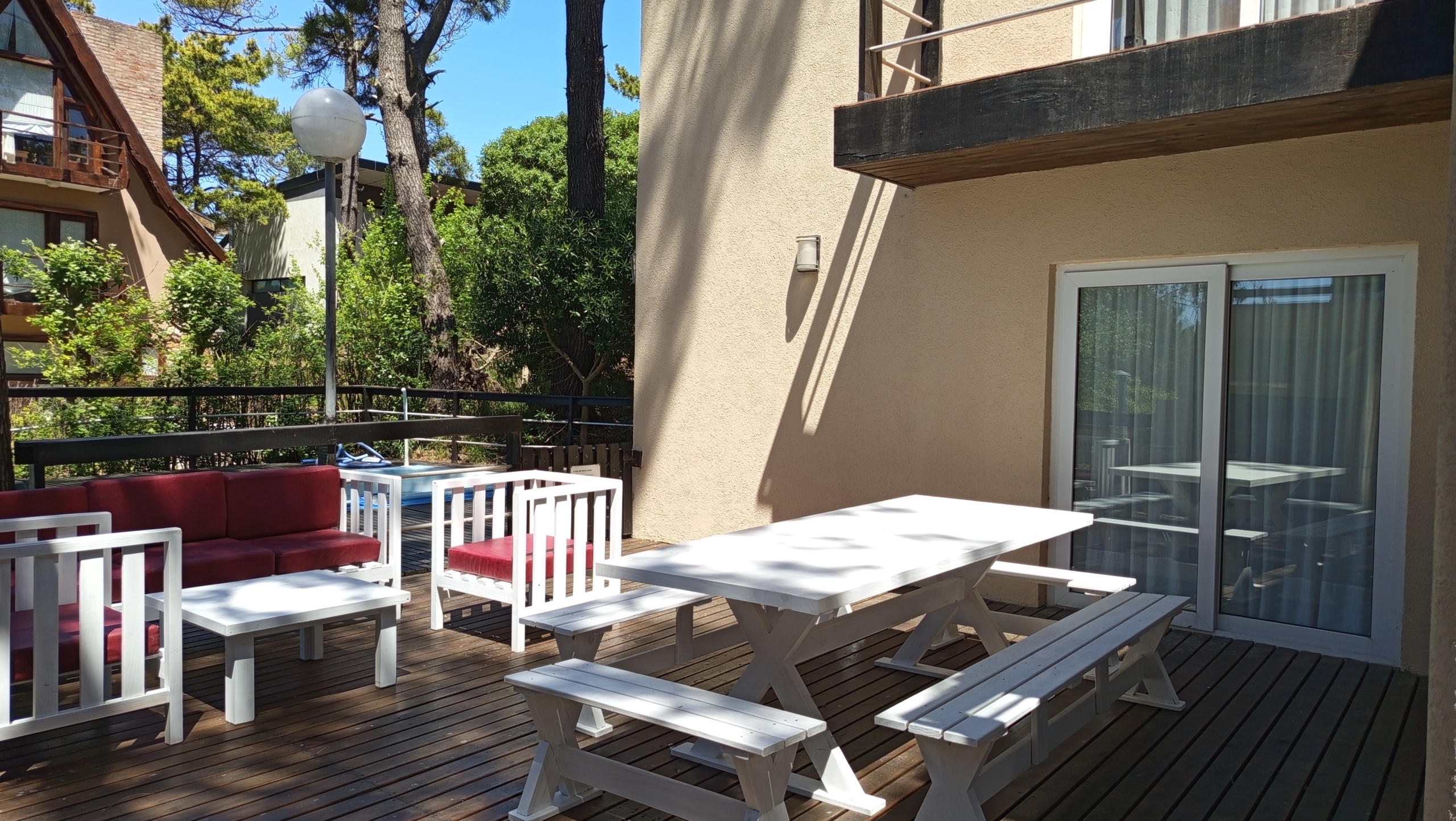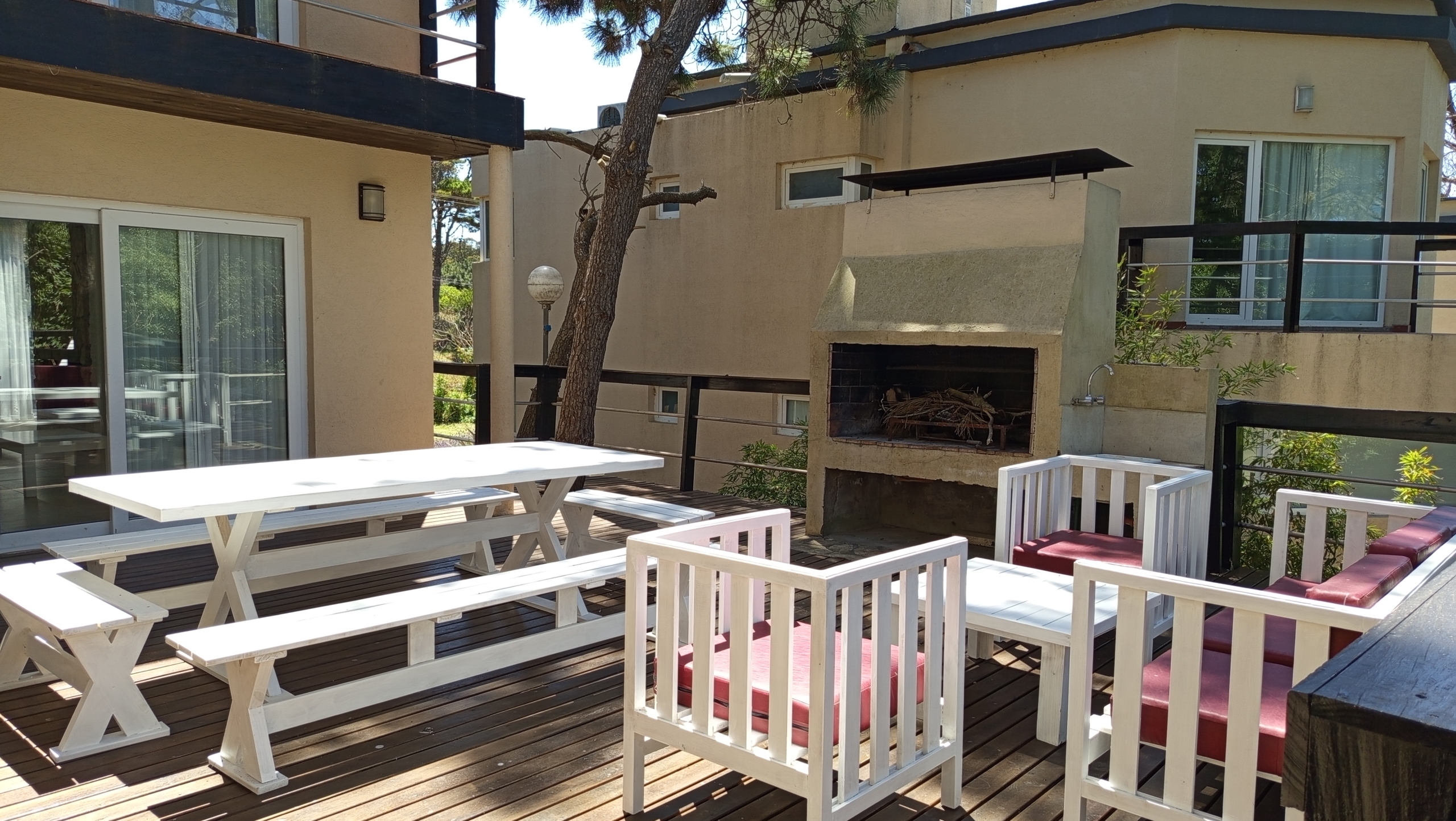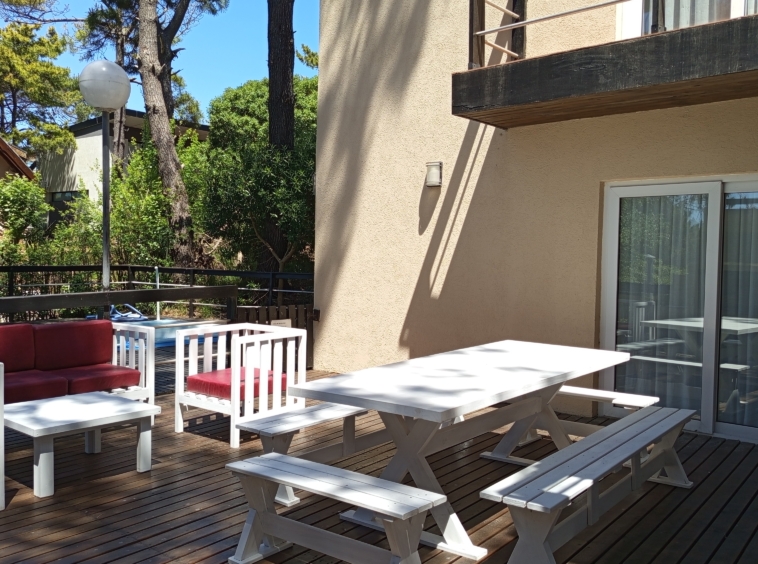 En el exterior, una amplia piscina rodeada de un deck de madera , parrilla y muebles de exterior.
